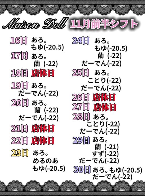 秋葉原・神田 みゃおみゃお 秋葉原 コンカフェ & メイドカフェりん@Rinnyann_myao·11月後半のおきゅよていです! 24日は何時までいるかまだ迷ってます...💭665
