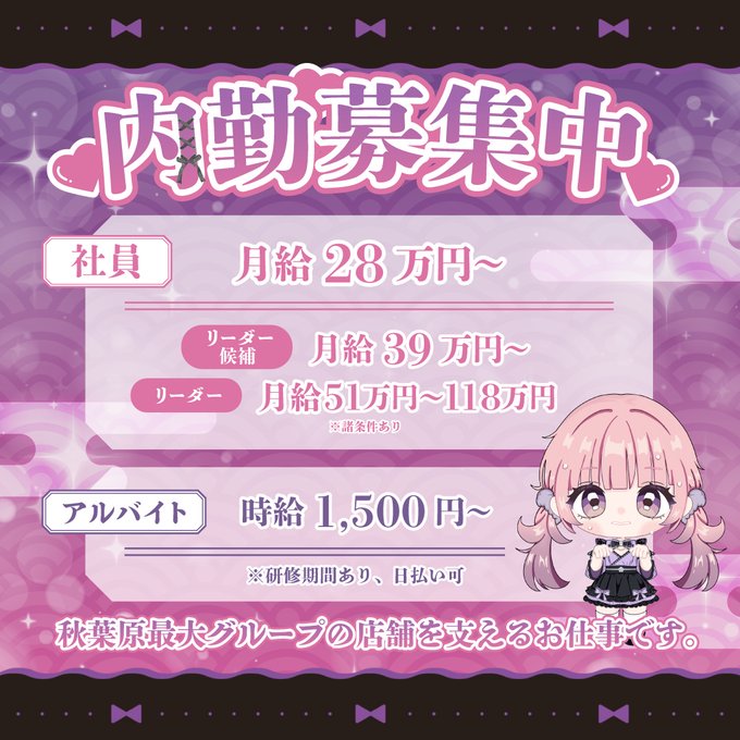 秋葉原・神田 NEO:ALCOHOLICNEO:ALCOHOLIC🧬秋葉原コンカフェ@NEO_ALCOHOLIC·||◤ ◥|| 内勤大募集! ||◣ ◢|| ✅充実した福利厚生 ✅学歴・経験不問 ✅圧倒的に早い正社員・役員登用 まずはアルバイトでもOK‼️ ご応募はコチラ ➩ http://lin.ee/BzqLK9j 詳しくはリンクをチェック! http://akiba-mgroup.com/recruit/ #秋葉原 #求人76
