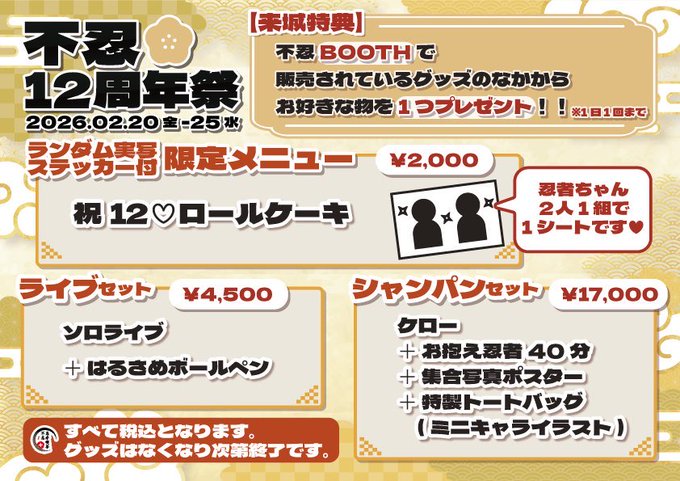秋葉原・神田 忍者喫茶不忍カフェ秋葉原万世城秋葉原 忍者喫茶 不忍カフェ🥷ninja cafe@sinobazu_cafe·2月18日(水) 本日の忍者ちゃん🥷💝 16-22 めいこ きつね(-21) ルヰ(-21) 16:30-22 こもも 17:30-22 かえで 18-22 つばさ 19-22 よつば 19:30-22 かなう 本日もたくさんのお殿様お姫様のご来城お待ちしております🙇♀️🤍 次のイベント⬇️ 2/20(金)~25(水)不忍12周年祭✨56592