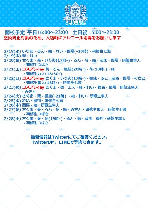秋葉原・神田 私立輝羅星学院プリンス部固定私立輝羅星学院プリンス部@kiraboshiprince·【開校予定】登校予定を更新しました イケメンの男装部員がカフェでお待ちしています 入り口にアルコールジェルを設置してありますので、ご利用ください DM、LINEでカフェの予約が出来ます12229