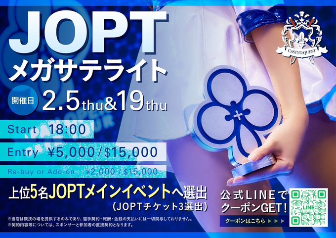 秋葉原・神田 カジノクエストカジクエ@秋葉原@AKB_CASINOQUEST·♣️【JOPTメガサテライト開催】♣️ 📅2/5(木)&2/19(木) ⏰18:00 START 💚公式LINE登録で超お得💚 \ JOPTサテライト対象クーポン配布中! / 当たれば【¥1,000引き】 はずれても【アドオン¥500引き】 🌟必ずどちらか当たる! 参加予定の方は 🔽今すぐLINE登録してクーポンGET🔽さらに表示1273