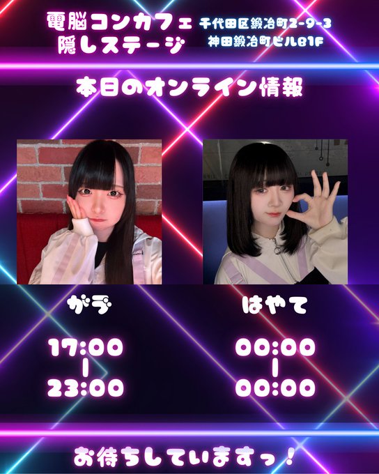 秋葉原・神田 電脳コンカフェ 隠しステージ🎮🎧電脳カジノコンカフェ ♠♥ 隠しステージ ♦♣神田・秋葉原エリア@kakushistage·12月08日(月)は 🌸出勤キャスト はやて👋 @HAYATE_Kstage 【メンテナンス中】 がゔ🍇 @Gav_Kstage 💴 チャージ:15分250円 🥤 ドリンク:600円〜 🕓 営業時間:17:00〜21:00 📍 神田駅徒歩2分 #隠しステージ #推し活ポーカー #コンカフェ1245