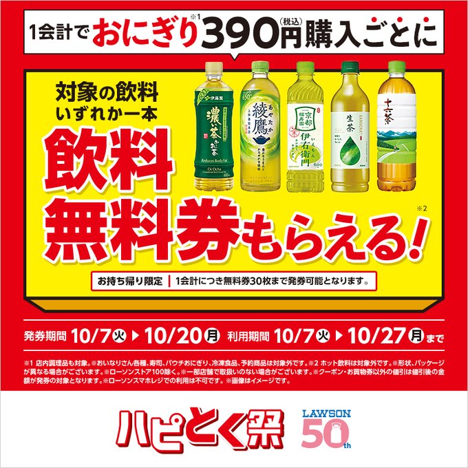 正方形のプロフィール画像ローソン@akiko_lawson\ハピとく祭/ 1会計でおにぎりを390円(税込)買うごとに、対象のお茶が1本もらえます♪ ぜひこのチャンスをお見逃しなく(^^)詳しくはこちら♪lawson.co.jpから333481,392722万プロモーション