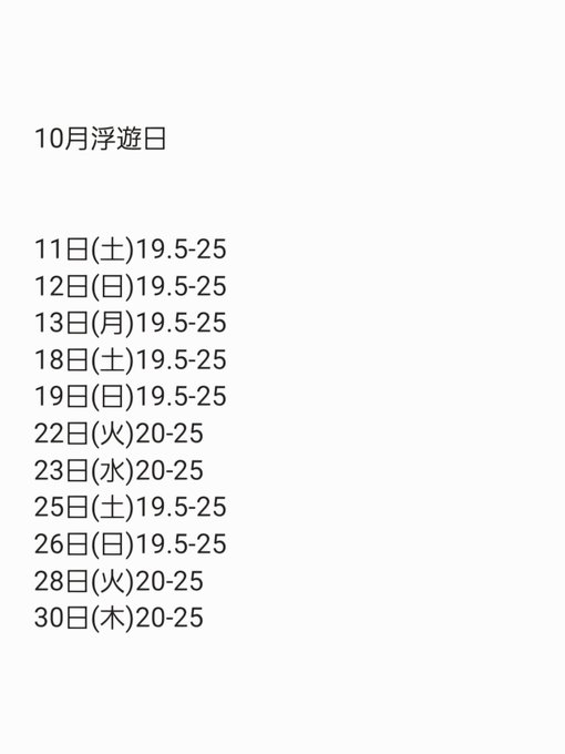 ちい にゃ🐼まよらー@alco_chii·4時間10月残り⭐️⬇️ 10日(金)18-23:30 12日(日)18-23:30 15日(水)18-23:30 16日(木)17:30-23:30 24日(金)19-23:30 ハロウィンコス🎃 26日(日)19-23:30 ハロウィンコス🎃 31日(金)19-23:30 わたあめねき卒業😿 希望あればラスト🉑です⭐️引用ちい にゃ🐼まよらー@alco_chii·9月30日💜1285