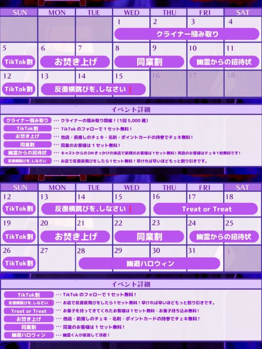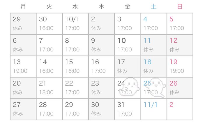 固定すず@cp_suzu_·10月の出勤予定です🎶🎃 29~31日のハロウィンイベント全日いますので、会いに来てください,,>᎑