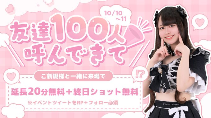 固定Classy Princess👑秋葉原コンカフェ(16:00~25:00)@cp_akb·꧁——————————꧂ 友達100人呼んできて ꧁——————————꧂ 10~11日開催 ご新規様と一緒に来場で・・・ 延長20分無料+終日ショット無料🔴 ※イベントツイートをRP+フォローで適応 #秋葉原 #コンカフェ #コンカフェ営業1485