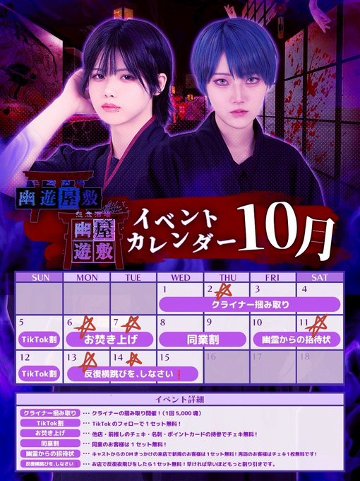 固定しまっぽ🏝幽遊屋敷@yuyu_shima_·👻10月浮遊日👻 変動あるかもだけど予定頂ければ確実に出勤します‼️ 10月もよろしくお願いします‼️ #男装 #男装喫茶 #男装カフェ #コンカフェ #中性 #秋葉原 #アキバ #メンコン2394