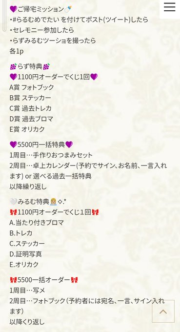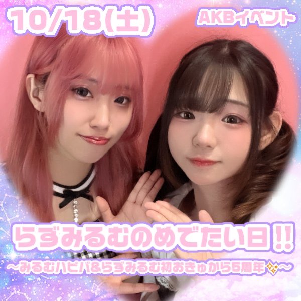 固定らず@みけねこカフェ秋葉原@razumikecat·らずみるむイベの詳細出ました‼️ らずへの5500円一括オーダー2周目特典の予約はこちらのポスト(ツイート)にリプライ又はご帰宅の際口頭で承ります🙇🏻♀️ 〆切は10/13(月)23:59までです! また、ケーキのプレゼントについてですが、らずは周年イベなのでらず単体宛は受け取れないのでご注意ください⚠️211344