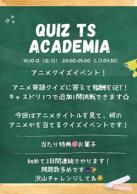 固定TRIBECA -STAGE-@TRIBECA_STAGE·🏫#クイズTSアカデミア🏫 開校です🥰 今回は!3日間開催 タイトル当てクイズです✏️ 英語のタイトルをみて何のアニメか当ててください✨ キャスドリ1で問題を追加出来ます💫 たくさん問題に答えてお菓子を集めましょう‼️ ご来校、お待ちしております♪ #トライベッカステージ22239
