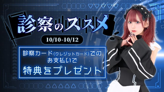 固定NEO:ALCOHOLIC🧬コンカフェ新店舗@NEO_ALCOHOLIC·━━━━━▼━━━━━ 診察のススメ 10/10 - 10/12 ━━━━━▲━━━━━ ご来院の際はカードをお忘れなく💳 診察カード(クレジットカード)での お支払いで特典をプレゼント!1316