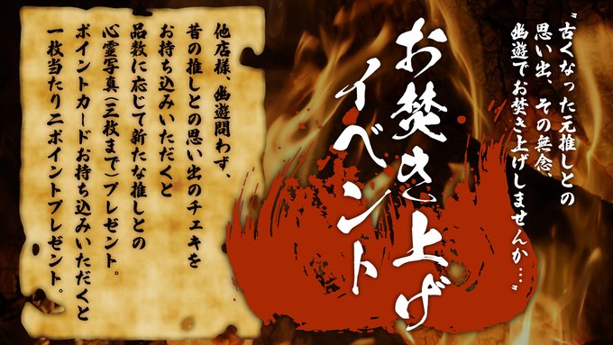 幽遊屋敷∞メンズコンカフェ@uuyashiki_akiba·10月6~7日のイベントはこちら! 👻╋━━━━━━━ 🔥お焚き上げイベント🔥 ━━━━━━━╋👻 古くなった元推しとの 思い出、その無念、、、 幽遊でお焚き上げしませんか。。。? #メンコン #メンズコンカフェ #秋葉原 #コンカフェ #コンカフェ営業 #メンコン営業209