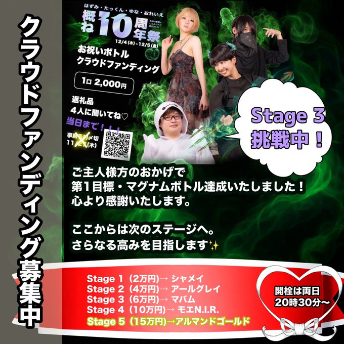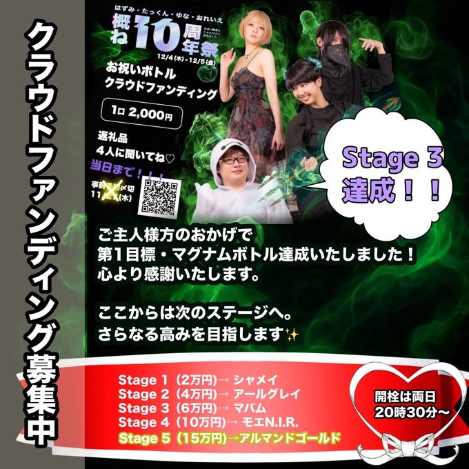 秋葉原・神田 アキバギルドアキバギルド メイドカジノ@AkibaGuild·5時間▼Stage 3達成しました!! ご主人様方のあたたかいご支援のおかげで、 Stage 3(6万円)を達成いたしました!! 心より感謝申し上げます🥹✨ 次は Stage 4(10万円) を目指して進んでまいります! 引き続き応援していただけたら嬉しいです🍾💛 🔽お申し込みはこちら https://x.gd/6njo3さらに表示引用アキバギルド メイドカジノ@AkibaGuild·21時間▼Stage 3挑戦中! ご主人様方のお力添えにより、 第1目標のマグナムボトルは無事達成いたしました…! 本当にありがとうございます✨ ただいまStage 3(6万円)に挑戦中! 次のボトルを一緒にお迎えできたら嬉しいです🍾💚 クラウドファンディングは当日まで受付中! ご支援頂けますと幸いです🙏💫 x.com/akibaguild/sta…21,154