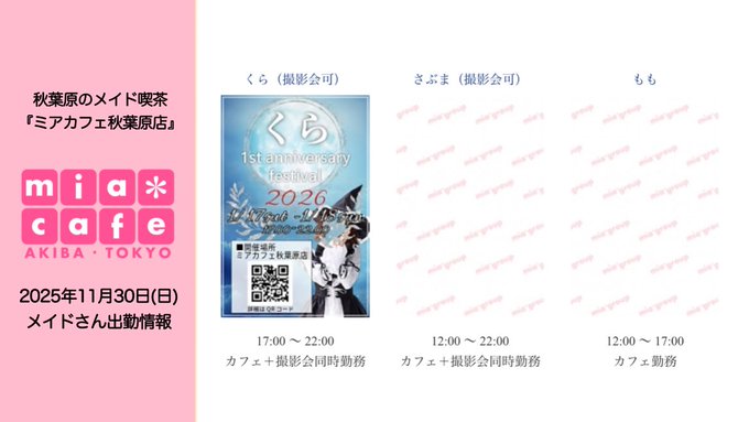 秋葉原・神田 メイドカフェ・ミアカフェ秋葉原店(2004年創業!)【公式】 秋葉原メイドカフェ ミアカフェ秋葉原店 🌸 メイドリフレ 撮影会 ミアリラ&フォト東京店@mia_group·👑本日11月30日(日)の総合案内👑 🎀ミアカフェ秋葉原店🎀 🍀本日12:00〜22:00オープン 🎀ミアカフェ山梨店🎀 🍀本日14:00〜22:00オープン 🎀ミアカフェ浜松店🎀 おやすみ→次回は明日12/1(月)、6(土)、7(日) 🎀ミアカフェ静岡店🎀 おやすみ→次回は12/6(土)! #メイドカフェ33206