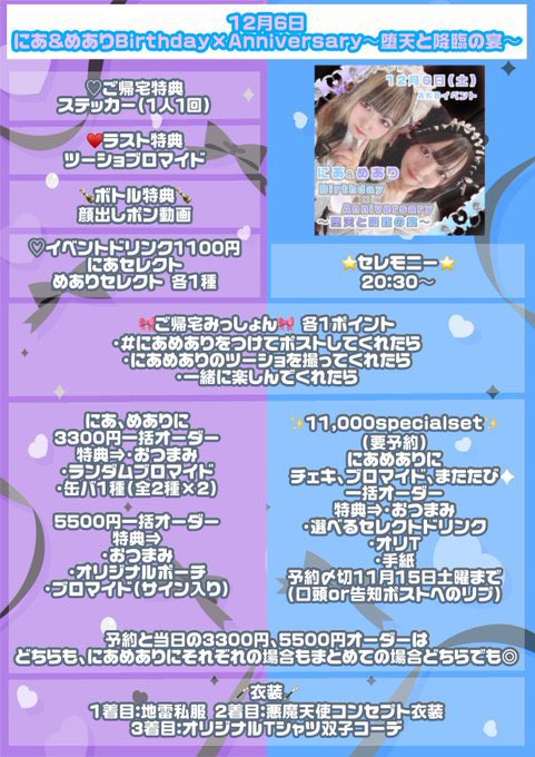秋葉原・神田 幽遊屋敷〜霊女編〜秋葉原コンカフェ固定【秋葉原コンカフェ】幽遊屋敷〜霊女編〜(16:00〜25:00)@uuyashiki_girl·.❀。• *₊°。 ❀°。.❀。• *₊°。 ❀°。 5年目もよろしく! 👻 11/30 開催 👻 .❀。• *₊°。 ❀°。.❀。• *₊°。 ❀°。 5年目もたくさんの人間様に会えますように! 当日は…💜1セット無料💜 ※RP・フォロー画面の受付提示必須 ※1,000怨以上のワンオーダー必須78785