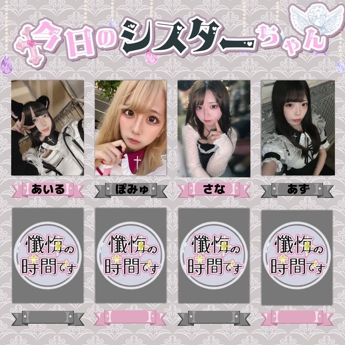 シスターカフェ ルルベール🤍秋葉原コンカフェ@Luluveil_2·10/5 出勤キャスト🤍 🤍みゆう @miyuu__lulu 🩵みづき @mizuki_lulu 🤍みう @miu_luluveil 🩵ちい @Chii_Veil 〜 20:00まで ✝️残り218日✝️ ご来館お待ちしています💫 #秋葉原コンカフェ #コンカフェ #コンセプトカフェ121123