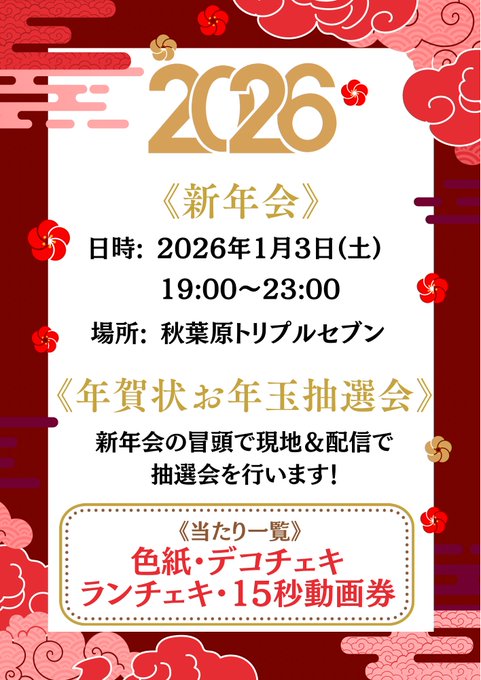 秋葉原・神田 秋葉原トリプルセブン有ゆうな😋❤️【ArcanaCharm】さんがリポストArcanaCharm@ArcanaCharm·11時間\♡嬉しいお知らせ♡/ ㊗️🎍新年会開催決定🎍㊗️ 日時: 2026年1月3日(土) 19:00〜23:00 場所: 秋葉原トリプルセブン システム: ・チャージ最初の1時間1,500円 ・延長30分ごとに500円 ・1時間1オーダー制(チェキ・プレドリを除く) =============================さらに表示引用ArcanaCharm@ArcanaCharm·13時間🎍🌅年賀状販売のお知らせ🌅🎍 【2026年推しメンからの年賀状♡】 を通販限定で販売します! あなたのおうちにメンバーから年賀状が届いちゃいます✨ なんと!あるあむお年玉賞品が当たるシリアルナンバー付き❕ お年玉賞品抽選会を2026年1月3日に秋葉原で開催予定!412810