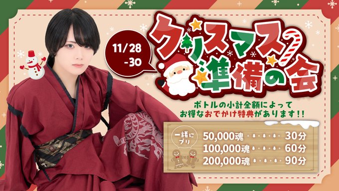 秋葉原・神田 幽遊屋敷 秋葉原 男装・メンズコンカフェしまっぽ🏝幽遊屋敷@yuyu_shima_·19時間浮遊👻 金曜日ですね、飲みましょう。 #男装 #男装喫茶 #男装カフェ #コンカフェ #中性 #秋葉原 #アキバ #メンコン引用幽遊屋敷👻男装コンカフェ@uuyashiki_danso·23時間11月28~30日のイベントはこちら! ゆうゆう🔔✨ 🎄クリスマス準備の会🎄 期間中は開栓ボトルの金額で豪華な特典が!! 特典でクリスマスデートに行っちゃお😊 詳しくは画像をチェックチェック!✅ #男装 #男装カフェ #男装喫茶 #コンカフェ営業 #コンカフェ4405