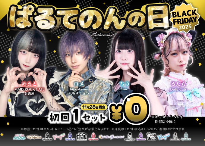 秋葉原・神田 メイドロックカフェ東京るたん🐰@ドーリーキャッツ@rutan_tencho·10時間華金みんな集合だよー😻🫵🏻🫵🏻🫵🏻🫵🏻🫵🏻引用ぱるてのんグループ@公式@parthenonpro_·11月19日11/28㈮はブラックフライデー! 毎月開催の ぱるてのんの日 も特別ver.で、 なんと終日1セットが『 0 円 』に!?✨ 年に一度の特別な一日を 話題のコンカフェで楽しみましょう🎶 ✧·˚⌖. ꙳✧·˚⌖. ꙳✧·˚⌖. ꙳✧·˚⌖. ꙳✧ #推しに出会えるぱるてのんグループ7305