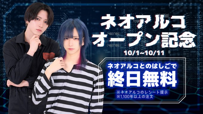 プリズンカフェ-秋葉原メンズコンカフェ-@prison_akb·10/1~10/11のイベントは💉🧬 『ネオアルコ オープン記念』 新店舗ネオアルコオープンを記念して ネオアルコとのはしご割レシート持参で プリズン終日席料が無料に⛓ お得に2店舗を楽しむチャンス🧬⛓ #秋葉原 #メンコン #コンカフェ #セット無料 #ネオアルコ #プリズン #はしご1100