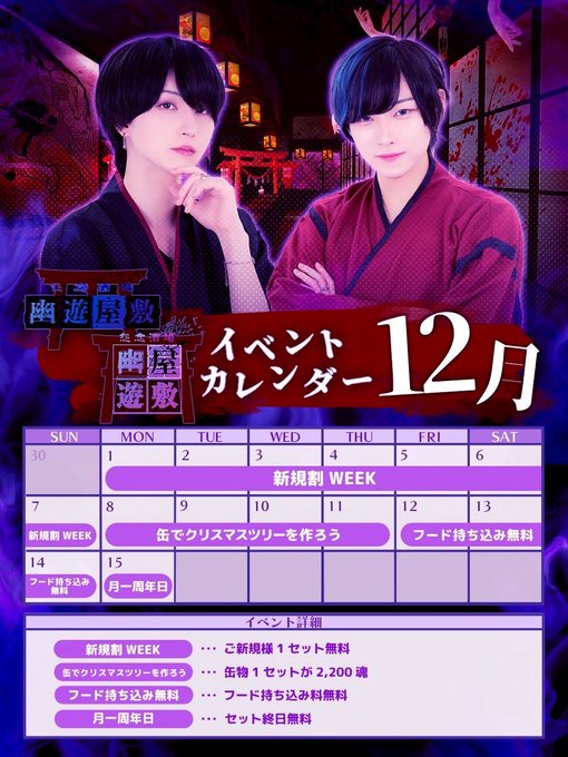 秋葉原・神田 幽遊屋敷 秋葉原 男装・メンズコンカフェつばさ🎠🪽幽遊屋敷@yuyu_tsubasa·🤍12月前半🤍【再掲】 1日 月曜日 🍼新規割 3日 水曜日 🍼新規割 4日 木曜日 🍼新規割 8日 月曜日 🍻缶もの割引 10日 水曜日 🍻缶もの割引 13日 土曜日 🍝フード持込🆓 15日 月曜日 ⛩月周年 ⚠️17:30~23:00です❣️ 時間早くもできるので、はやめに教えてください🤍🙏 他の日も調整🉑4103