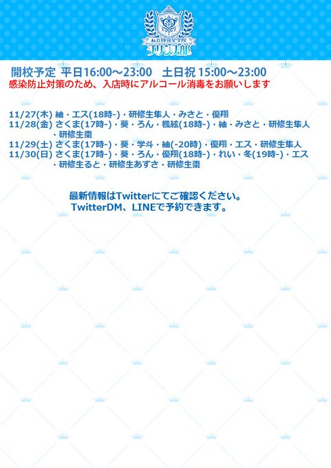 秋葉原・神田 私立輝羅星学院プリンス部固定私立輝羅星学院プリンス部@kiraboshiprince·【開校予定】登校予定を更新しました イケメンの男装部員がカフェでお待ちしています 入り口にアルコールジェルを設置してありますので、ご利用ください DM、LINEでカフェの予約が出来ます1192