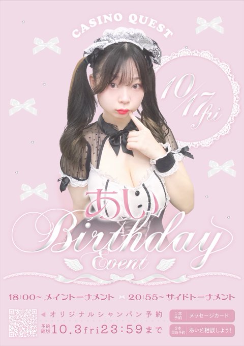 秋葉原カジノクエスト@AKB_CASINOQUEST·/ 🤍🎀あいちゃん生誕イベント🎀🤍 \ 💗⚡️ 10月17日(金)は… ⚡️💗 18時00分~ mystery bounty http://pokerguild.jp/tourneys/322419 20時55分~ AOF http://pokerguild.jp/tourneys/322420 #ポーカー #秋葉原 #アミューズメントカジノ #SPADIE #コンカフェ #コンカフェ嬢 #カジクエ #カジノクエスト1513