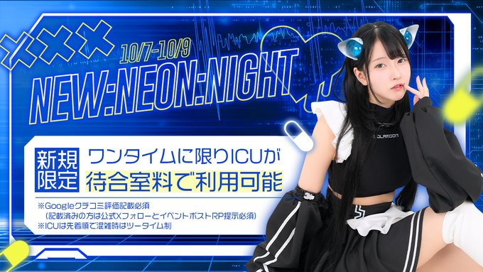 NEO:ALCOHOLIC🧬コンカフェ新店舗@NEO_ALCOHOLIC·━━━━━━━━━━━━✖✖ NEW : NEON : NIGHT 10/7 - 10/9開催🪩 ✖✖━━━━━━━━━━━ 【新規限定!】 期間中はICUをお得に利用するチャンス💉 🧬適用条件・注意事項はバナーをチェック!1187