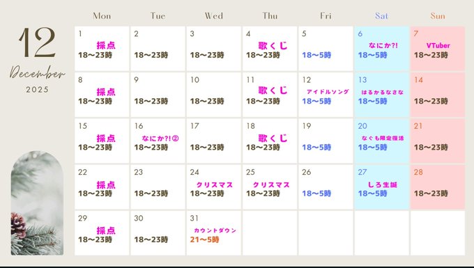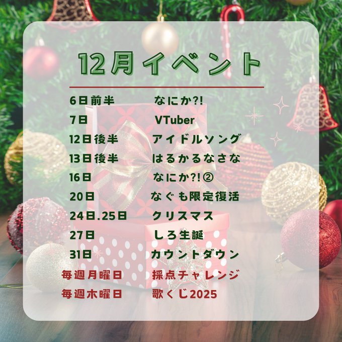秋葉原・神田 高まり研究所高まり研究所本店@takamariken·🎄本店12月カレンダー🎄 ⚠️注意⚠️ ▶31日 21:00オープン 📢イベント予定📢 🔸6日 前半 何か⁉️ 🔸7日 VTuber✨ 🔸12日 後半 アイドルソング🎀 🔸13日 後半 はるかるなさな 🔸16日 何か⁉️② 🔸20日 前半 なぐも限定復活💜 🔸24日,25日 クリスマス🎄 🔸27日さらに表示35481