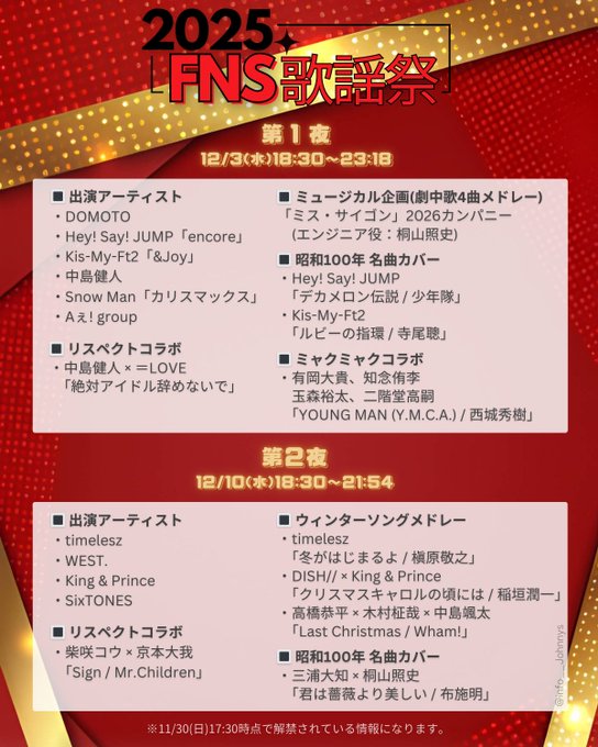 秋葉原・神田 私立輝羅星学院プリンス部優翔👾さんがリポストJohnny's information@info__Johnnys·【FNS歌謡祭 歌唱曲&企画発表】 第1夜 12/3(水)、第2夜 12/10(水) 「2025 FNS歌謡祭」(司会:相葉雅紀) ■第1夜出演アーティスト DOMOTO、Hey! Say! JUMP、Kis-My-Ft2 中島健人、Snow Man、Aぇ! group ほか ■第2夜出演アーティスト timelesz、WEST.、King & Prince SixTONES ほか #FNS歌謡祭231,9421万42万