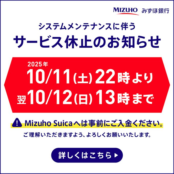 正方形のプロフィール画像みずほ銀行@mizuhobank【システムメンテナンスに伴うサービス休止のお知らせ】 ■サービス休止時間 2025年10月11日(土)22時~12日(日)13時 休止時間中、ATMにおけるみずほ銀行キャッシュカードのご利用や、電子決済サービスへのチャージ等がご利用いただけません 事前のATMのご利用等、ご準備をよろしくお願いいたします詳しくはこちらmizuhobank.co.jpから83635151,156万プロモーション