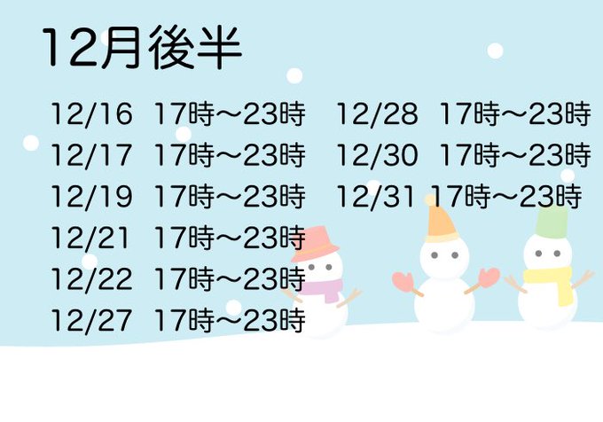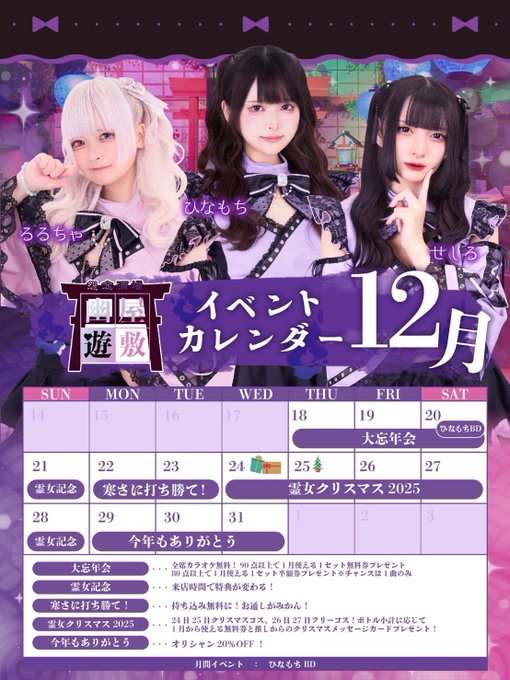 秋葉原・神田 幽遊屋敷〜霊女編〜秋葉原コンカフェはらぺこ!おいなりさん!!@DM動かない@reijo_inari·12月後半のシフトです! 28日以降はいません!!!211415