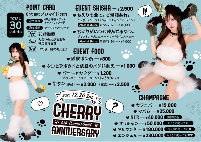 秋葉原・神田 Bunny's Guild バニーズギルド固定12月20日周年イベ🍒ちえりちゃん🐰@cherry0305_BG·12月後半 16日 18-24 19日 20-(?) 20日 19-5 ちえり周年イベント🍒 22日 18-24 23日 17-23 池袋留学 27日 21-5 29日 21-5 30日 21-5 1月 2日 21-5 3日 21-5 4日 18-2414371,299