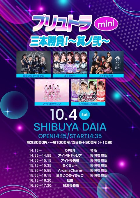 有ゆうな😋❤️【ArcanaCharm】@yuuna__0327·56分この後のライブこちら〜! 大切ライブ!!!! 初めて出演させていただくイベントです!! 入特豪華にして待ってます!!! 絶対来て欲しいでーーーす> < ♡引用ArcanaCharm@ArcanaCharm·9月29日♡ #あるあむライブスケジュール ♡ 10/4(土) 『プリュトラmini三本勝負!〜其ノ弐〜』 📍SHIBUYA DAIA ⏰OPEN14:15/START14:35 🎤15:35~15:55 💬終演後(16:20~17:30) 🎫 料金 前方3000円/一般1000円/当日各+500円(+1D別) https://t-dv.com/2pltr1004 販売開始:2025/9/30(火) 19:30-さらに表示4223