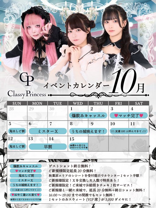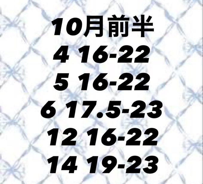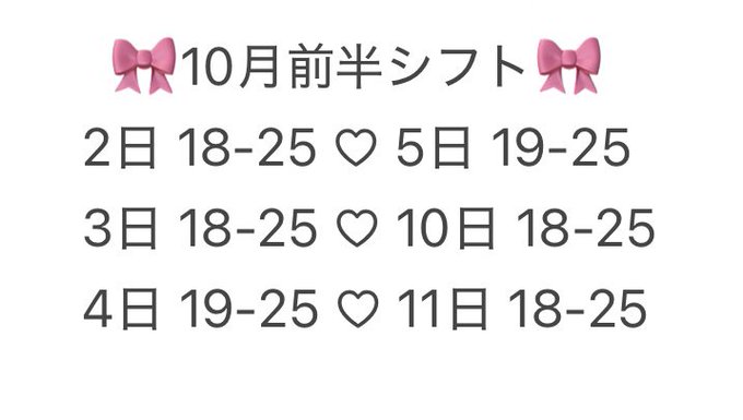 シマ💤@ビジュラム東京@shima_bjl·✧︎10月前半✧︎ 5日(日) 18-23👼🏻 10日(金) 19.5-23 12日(日) 15-23🍶 13日(月祝) 18-23 天使の日👼🏻 椿さん周年🍶 ご予約のDM待ってるよ~~~12168