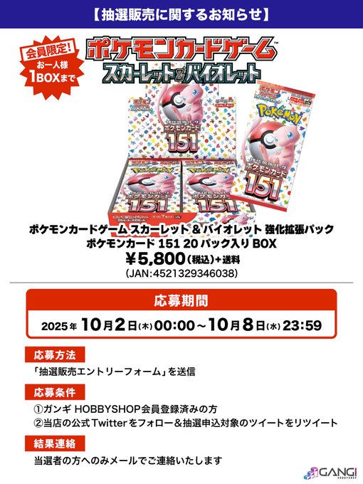 ちむたあやさんがリポストガンギ HOBBYSHOP@MS_GANGI·【ポケカ抽選販売のお知らせ】 ポケモンカードゲーム「強化拡張パック ポケモンカード151」が入荷しました😊 人気商品となっておりますので抽選販売とさせていただきます😌 ↓応募はこちら🌟 https://gangi.co.jp/blog/drawsale-566… ※結果は当選者にのみお送りいたします。 #ポケカ #抽選販売 #入荷5271万5,31233万