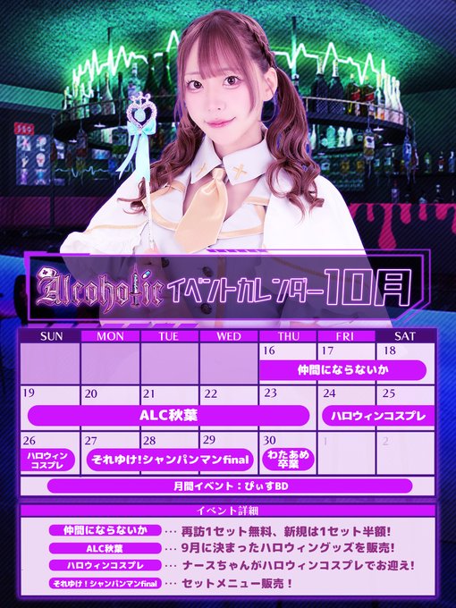 🩻ろく💉₆₆₆@あるこほりっく@alco_roku·20時間イベントカレンダーこちら🐣 ハロウィン気合い入れるぞーー‼️行ける日ある人はリクエストも募ります🎶引用【秋葉原コンカフェ】あるこほりっく(16:00〜25:00)@alcoholic_akiba·10月1日☆★━━━━━━━━━━━━★☆ あるこほりっく 10月イベントカレンダー ☆★━━━━━━━━━━━━★☆ ハロウィンイベントから・・・👻 新規さんに向けたイベントまで! #コンカフェ #秋葉原3178