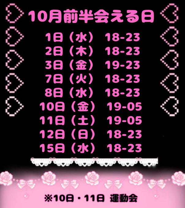 固定はな🌸みざりー@misery_hana·🌸10月前半会える日🌸 10.11は運動会でブルマです✨ その他の日もお得なので是非! 10月も頑張るぞー! 今月もよろしくお願い致します😌 この日行くよーってDM待ってます♡254