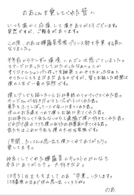 ろん10ガツ12ニチさんがリポストのあクン🐾🤍@輝羅星学院@noa_kun12·____ご報告_____ この度、のあクンは10月31日をもちまして 輝羅星楽員プリンス部を卒業致します。 登校スタイルはお約束登校がメインになると 思いますのでリプに貼ってある登校可能日を見た上でDMくれると嬉しいです オーラス居てくれる方はオーラスでと一言伝えてくれると嬉しいな🐾55331,456