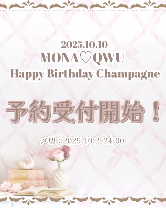 もな⚣🪞10/10BDev@mona_qc_·1時間シャンパン予約が明後日までです!誕生日といえばシャンパンでしょ?よろしくお願いします🥺引用もな⚣🪞10/10BDev@mona_qc_·9月22日【シャンパン予約受付開始!🥂】 中庭の通常メニューのシャンパンもお声がけいただければ確保いたします。その他ご希望ありましたら、お気軽にもなくぅまでご相談ください🙇🏻♀️27434