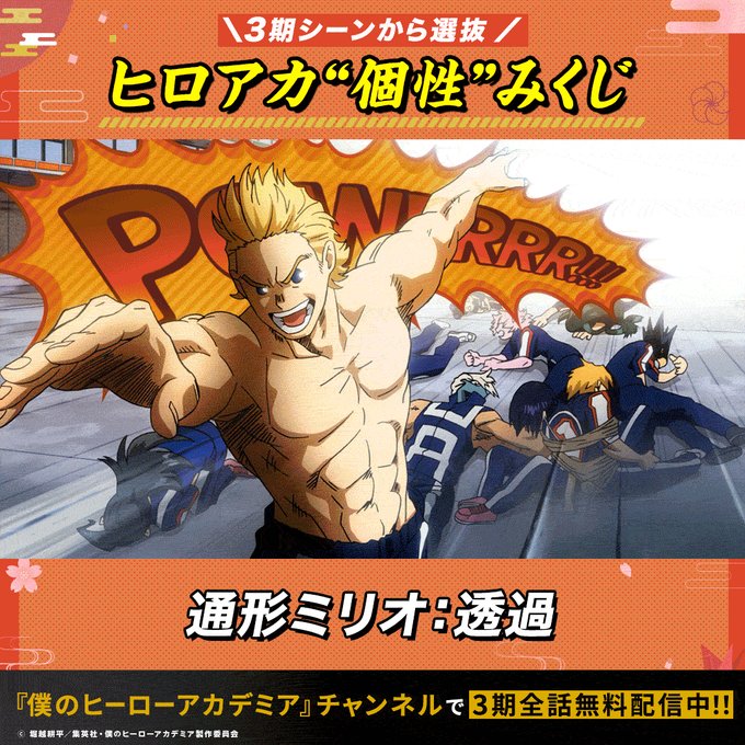 正方形のプロフィール画像ABEMAアニメ(アベマ)@Anime_ABEMA僕のヒーローアカデミア FINAL SEASONまであと5日 第3期から選抜 ヒロアカ”個性”みくじ 好きな”個性”が出たらリポストで教えてね ◥◣アベマでヒロアカ◢◤ 期間限定専門チャンネルで TVアニメ厳選エピソードを毎日ノンストップで全話無料放送中 FINAL SEASON 10/4(土)放送開始! @heroaca_animeGIF32111336万プロモーション
