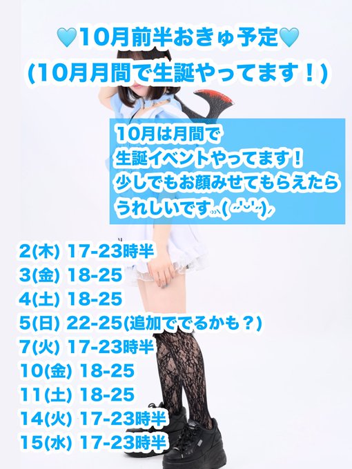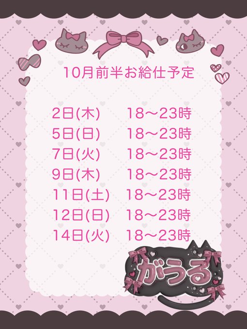 固定りまちゅ✧·˚⌖. ꙳@alco_rimachu·10月前半お給仕予定表🗓 平日も、いまふ。ですので来てくださいね いつも通り金土メインではありますが9月会えてない患者様っちゅは詫び来店お願いします😸🫵😁 来店予約はdmにておねがいします🌠2181