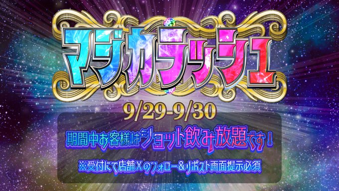 すずき🐟幽遊屋敷さんがリポスト幽遊屋敷👻男装コンカフェ@uuyashiki_danso·9月29~30日のイベントはこちら! ⛩ ~マジカラッシュ~ ⛩ 期間中はなんとなんと!! お客様は【 爆弾酒飲み放題 】です!?🍻✨ たくさん飲んで楽しみたい方! ご来店お待ちしております!🙇♂️🙇♂️ ※Twitterのフォロー、ツイートのRT必須 #飲み放題 #テキーラ飲み放題411,400