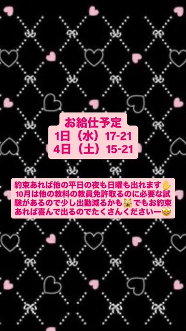 ひめな💍@alco_himena·10月後半で会いに行きたいよ〜って方いらっしゃいましたら【今日中】に連絡ください!!! 遅くても明日の朝まで!!!!!!! 日にちと時間とセット数で教えて下さるとすっっっごく助かります😭 10月前半と11月は全くいません!!!!!12547