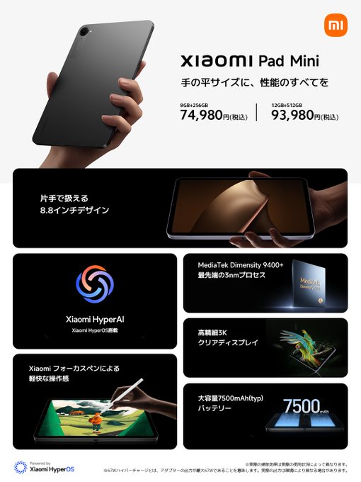 正方形のプロフィール画像Xiaomi Japan@XiaomiJapan【本日より発売!Xiaomi Pad Mini】 Xiaomiシリーズ初のコンパクトタブレットが日本上陸です。 8.8インチのディスプレイに、 高性能をギュッと詰め込みました。 デュアルUSB Type-Cポートも超便利です。 お値段74,980円からです。 購入リンクはリプライにて。44442953202万プロモーション