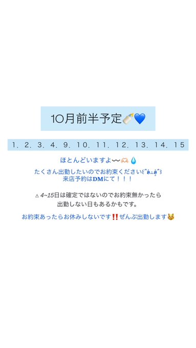 つばさ🎠🪽生誕9/27@yuyu_tsubasa·🤍10月前半🤍 14日 火曜日 17~23 15日 水曜日 17~23 少なめです!!🥲 前半はゆっくりして美術館を巡る予定です…ᐠ( ᐢ ᵕ ᐢ )ᐟ お約束まってます!🫶132