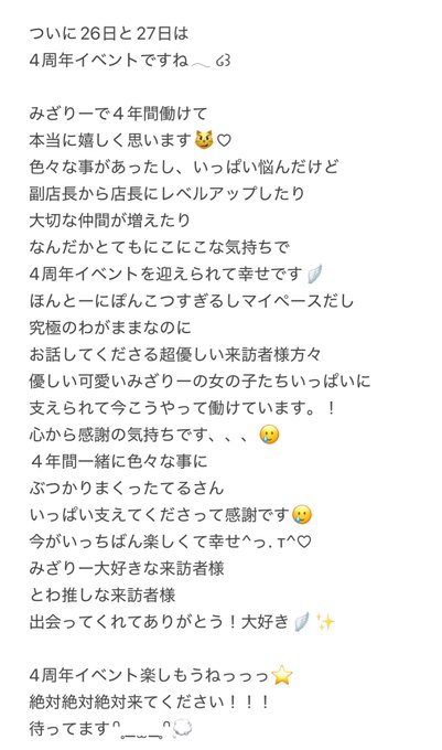 巫 茨音🦥🪐(かんなぎ しのん)@niaaani_123·6時間おきゅおわ♥ 本日も、、、 いちごミルクがあまりにも美味しいことを発見してしまった方!鯛明太美味しかったね😉 お仕事頑張ってから来てくれた🍎くん! すき家🐮🍚の話沢山して楽しかった! ワンオペ頑張った褒めて😼😼😼👊引用巫 茨音🦥🪐(かんなぎ しのん)@niaaani_123·13時間おきゅいん♡ ワンオペ頑張る💪 来れるよって人はDMしてね😸 #コンカフェ #コンカフェ営業ください #秋葉原コンカフェ #ルナパラドックス521505