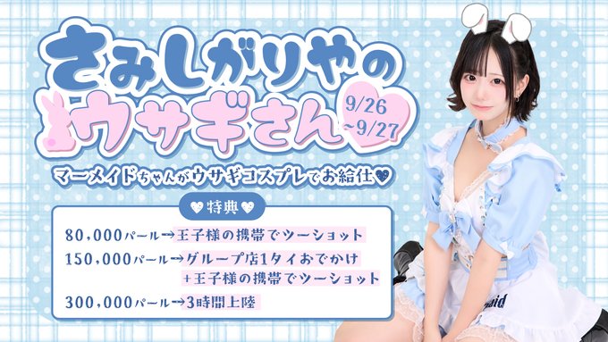 天羽のあさんがリポストMermaid(マーメイド)秋葉原🧜♀️コンカフェ🌊@mermaid_bar·ʚ・・・・・・・୨୧・・・・・・・ɞ さみしがりやのウサギさん🐇 ꒰꒰ 9/26・27開催 ꒱꒱ ʚ・・・・・・・୨୧・・・・・・・ɞ マーメイドちゃんがうさぎに変身!?🎀 期間中は豪華な特典も! 寂しくならないように会いに来て💕 #秋葉原 #コンカフェ #コンカフェ営業161,157