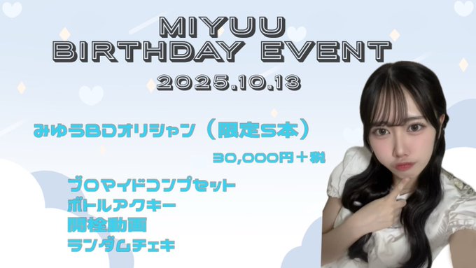 ゆきの🐧さんがリポストみゆう🫓10/13予定あけといて!!!@miyuu__lulu·🎈みゆうお誕生日会🎂 初めての生誕初めてのオリシャンでちょっぴり不安ドキドキです! 20歳リアルバースデー!初めてのお酒みんなで乾杯しよーう🥂 ⚠️お席、オリシャンの予約はルルベール公式【@Luluveil_2 】までお願いします🤍 (ご希望の来店時間、滞在時間、人数の記載をお願いします💌)15303,863