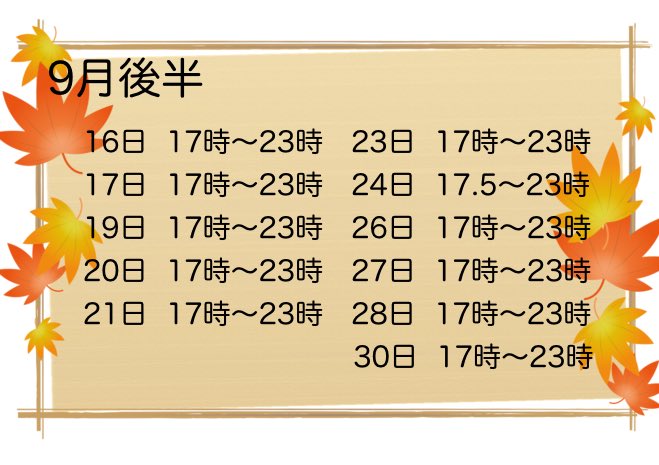 まゆさん@mayu_ozzZZ·5時間今日祝日だったことにとても驚いてます。引用ルナパラドックス -LUNA PRDX-@studio_annex·10時間9/23(火)秋分の日⛅️ 【LAB】17-23 きら@kkkkk__ra まゆ@mayu_ozzZZ むーん17.5-@1O4O6O3O3 ぷりん18-@nattou_purinn 【本館】18.5-23 サイト-22 @death_sunteam ひまり19-@himahima_ri_0 🥂特価パティオ🍊すらっと🎐ラムネ 🐟本館ねぎとろ丼特価🈹新規割引ありさらに表示4257