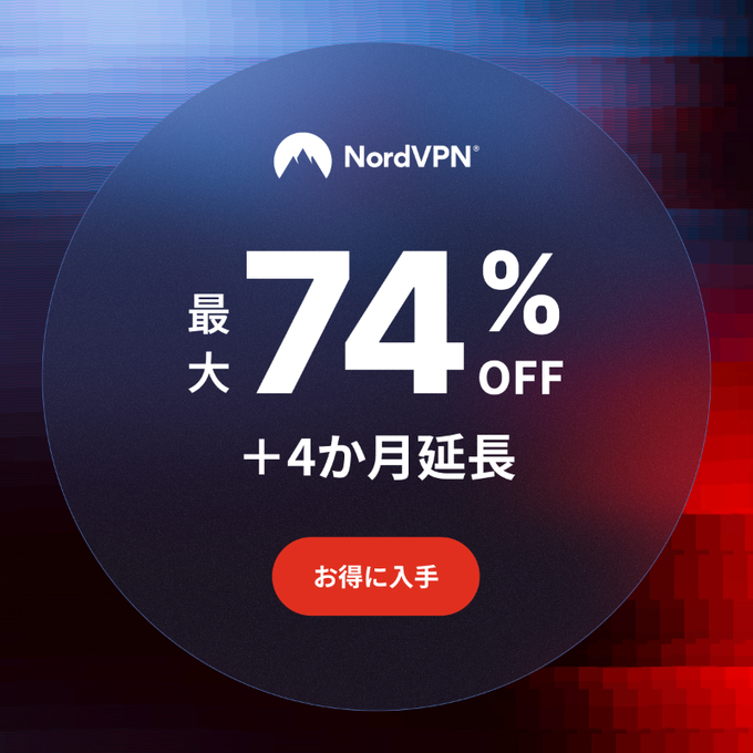 正方形のプロフィール画像NordVPN@NordVPNネットの脅威は世界共通。信頼のVPNでプライバシー保護。 今ならNordVPNが最大74%オフ、さらに4カ月延長。お得にはじめてみませんか?今なら最大74%オフnordvpn.comから222万プロモーション
